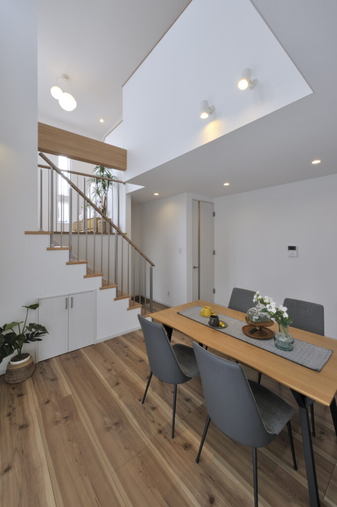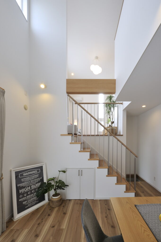 スキップフロアから吹き抜けへと開放感のある空間が広がる。