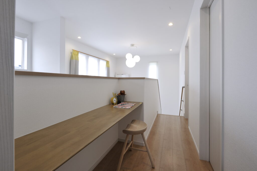 階段を上がると廊下に併設されたスタディコーナー。